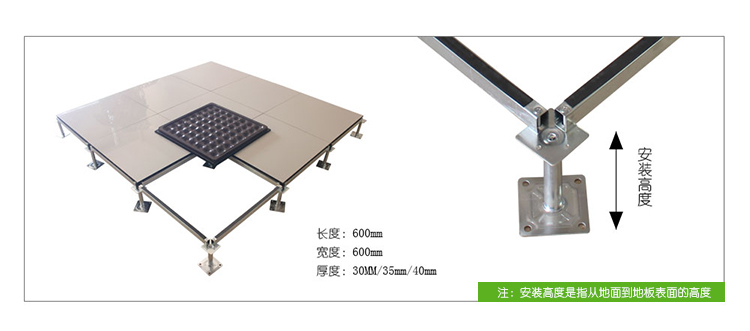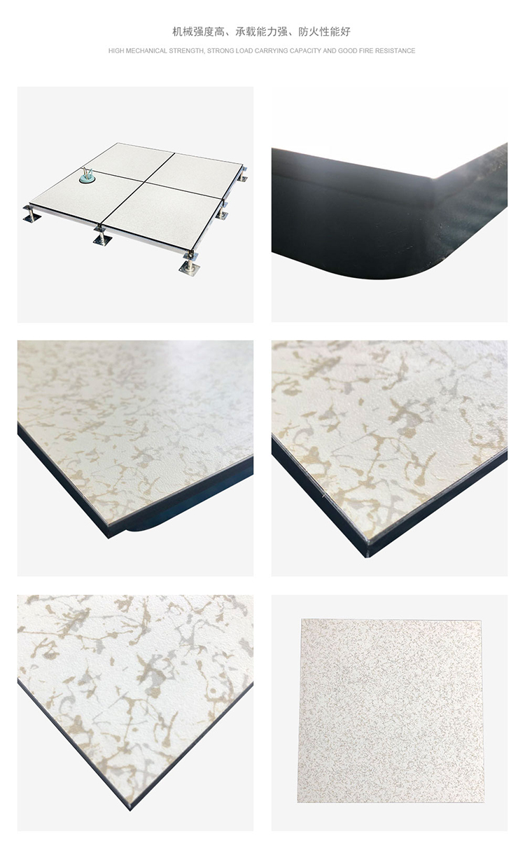 全鋼防靜電地板為全鋼組件,分有邊、無邊、微邊(三種邊處理方式)。底面采用SPCC深沖冷軋板拉伸成型鋼板厚度(0.4~1.5mm),球窩狀結構,增加地板的機械荷載強度。面板采用硬質SPCC鋼板(0.5~2.0mm),上下經過點焊焊接成型,切邊沖孔后,經防銹處理,環氧樹脂粉末靜電噴涂后,中間填充發泡水泥(可以根據客戶需求發泡不同重量),再經過日曬養護后形成穩定的承載結構。地板上表層粘貼防火板(HPL)/復合PVC/ 通體PVC/陶瓷地磚等不同材質的裝飾表層,達到產品花色的多樣性、可以根據客戶需求個性化定制產品。搭配聯網支架、支架、螺釘組裝后,定位聯接更加準確、精度可靠。