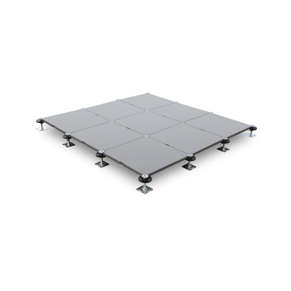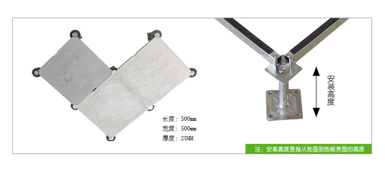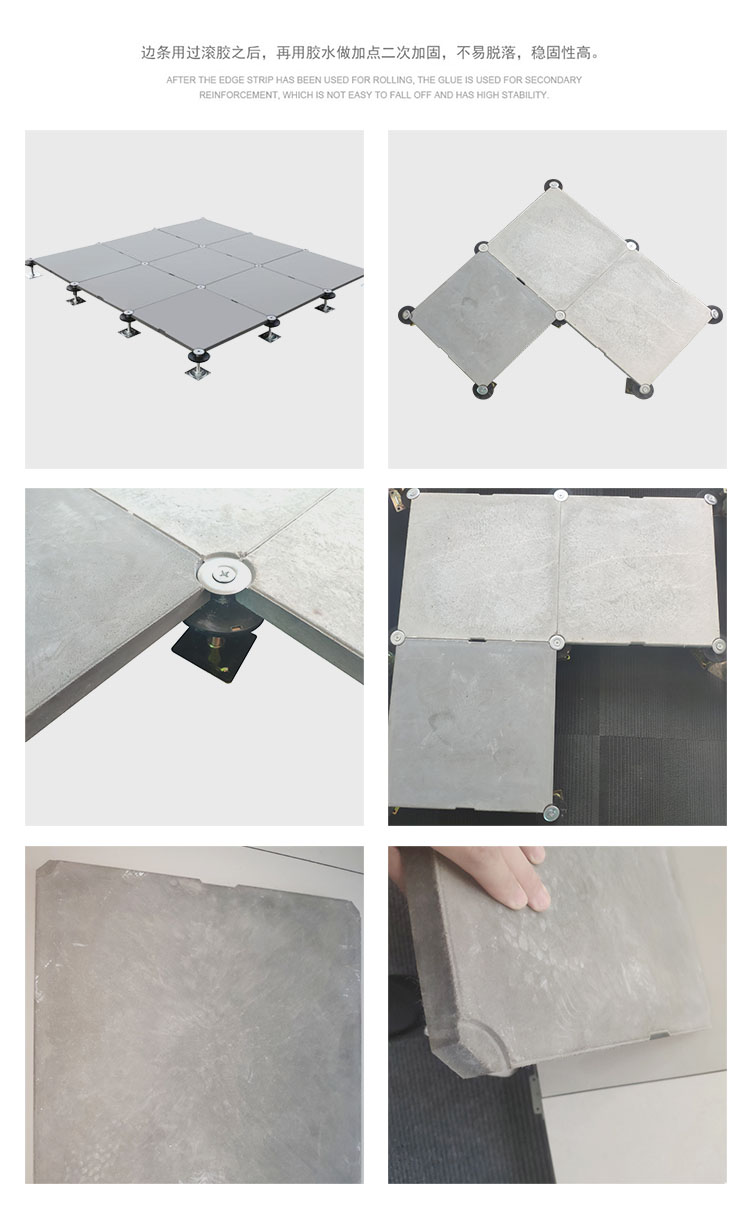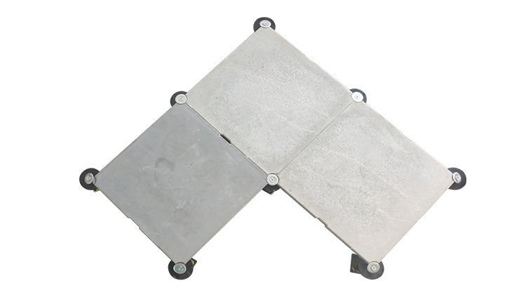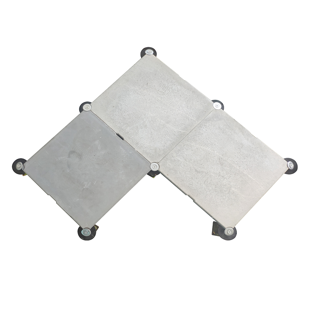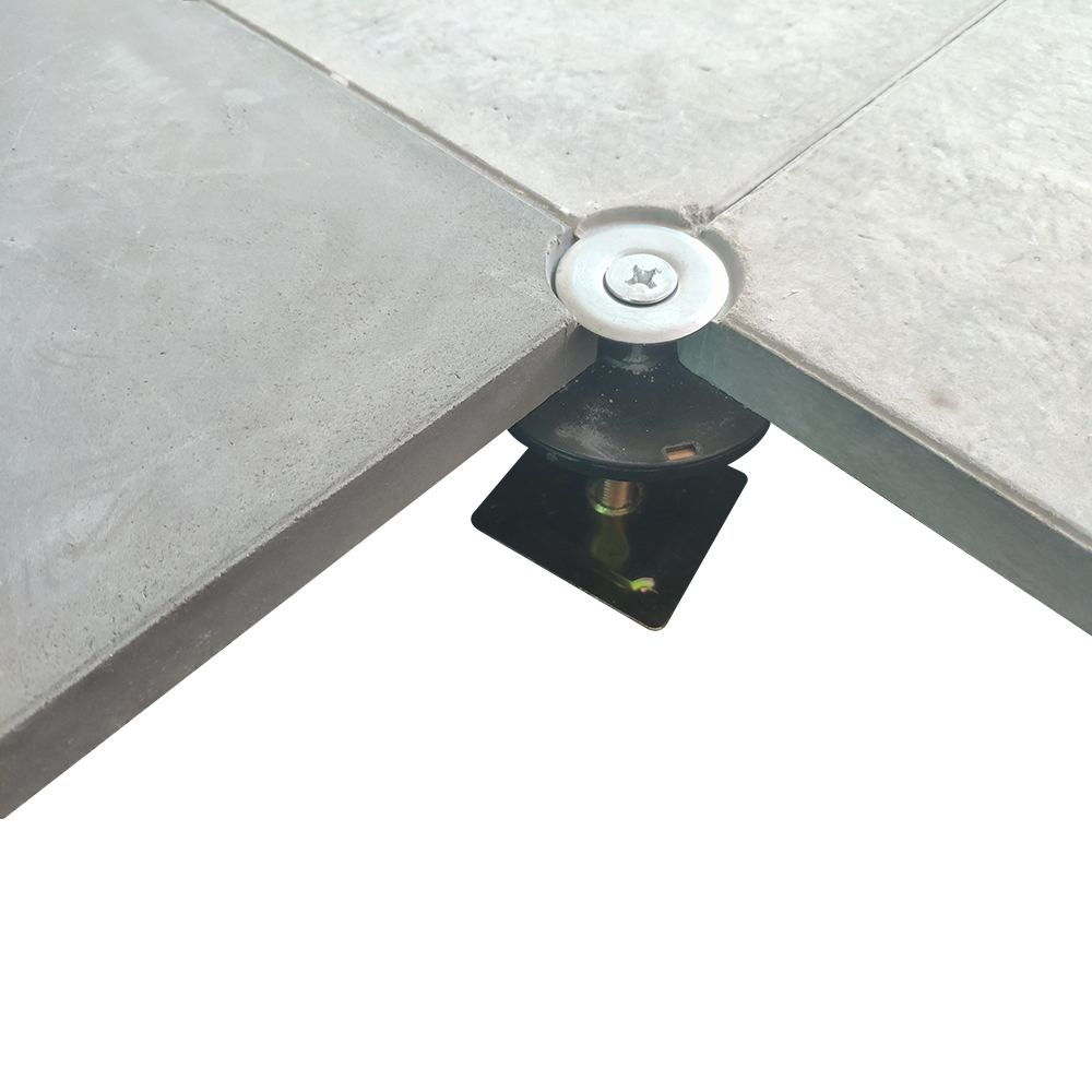 GRC水泥地板是由硅酸鹽、無機纖維、礦物纖維、石英砂等材料經過高壓一次成型的環保地板,每塊地板自帶穿線孔。地板四角鍍鋅底座支承,不帶橫梁系統。每塊地板四角有90度圓弧,四塊板組合而成后形成一個圓,有一個鐵制螺母壓角固定。鋁頭上配有圓形緩沖定位橡膠墊,防止地板受力后顫動引起的響聲。支架高度可調5cm。